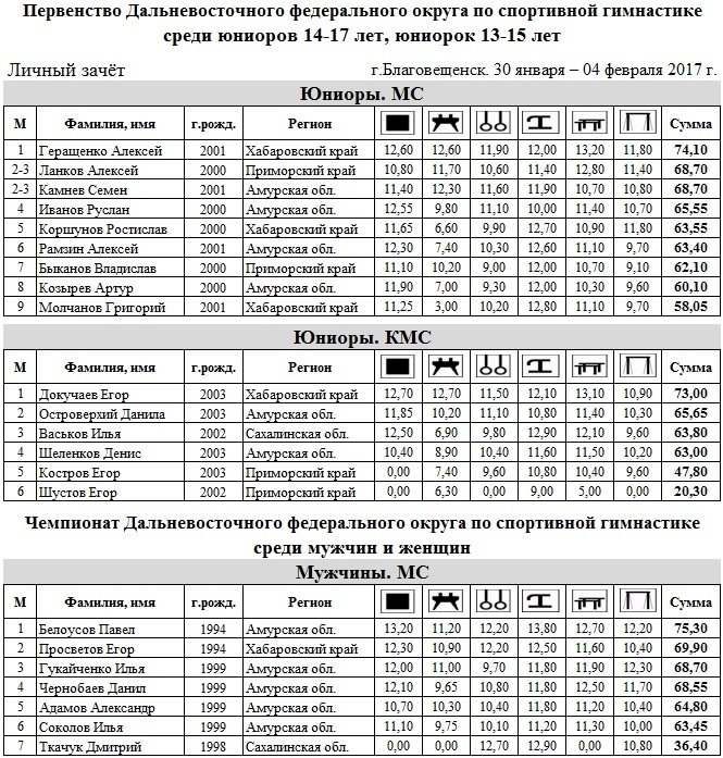 В Благовещенске с 1 по 3 февраля прошли первенство и чемпионат Дальневосточного федерального округа по спортивной гимнастике. В лично-командных соревнованиях приняли участие гимнасты из Якутии, Сахалина, Приморского и Хабаровского краёв. «Прошло всё по регламенту и без травм, это немаловажно, — рассказал главный судья соревнований Георгий Вагнер. – Борьба была практически на равных и очень интересной. В личном зачёте некоторые места спортсмены даже поделили. Но все получили награды, думаю все довольны. Теперь мы самых достойных будим готовить к первенству и чемпионату России. Всех победителей мы, наверное, не сможем отправить, по финансам сейчас это сложно, но самые достойные поедут». Гимнасты Амурской области поднялись на высшую ступень пьедестала в командном первенстве среди юниоров, мужчин и женщин, команда Приморского края выиграла среди юниорок. Каждый тренер на этих соревнованиях ставил определённые задачи перед своими воспитанниками, результатами остались довольны наставники из Хабаровского края: «Наши ожидания оправдались, на первенстве среди кандидатов в мастера спорта мы взяли первое место и в отдельных видах выиграли пять снарядов, — рассказал тренер из Хабаровского края Сергей Ташлыцкий. – В первенстве по многоборью наш гимнаст занял первое место, а на чемпионате в многоборье – второе. Были ещё призовые места, в целом результат оправдался, могли ещё выиграть, но видно, что ребята устали под конец соревнований, стали появляться погрешности в выступлениях». Успешно выступила на чемпионате Дальнего Востока амурская гимнастка девятиклассница Анна Руднева. До этого она побеждала среди юниорок, а сейчас заняла первое место среди взрослых в личном зачёте, также выиграла в отдельных видах по вольным упражнениям, на бревне и брусьях. «Конечно я довольна результатом, теперь буду готовиться к чемпионату России. Правда в девятом классе надо ещё готовиться к экзаменам, но на каникулах у меня будет по две тренировки в день», — рассказала Анна Руднева. гимн3(50) гимн2(75) гимн(75)