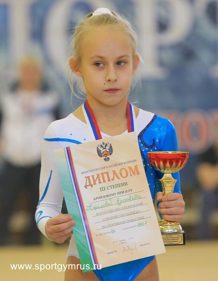 Карелову Елизавету с бронзовой медалью в многоборье по программе 2 разряда