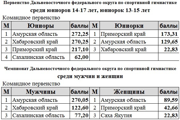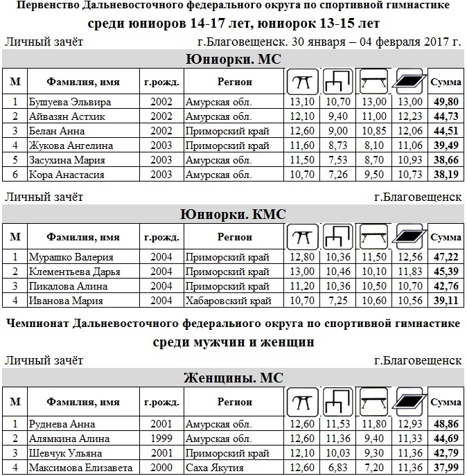В Благовещенске с 1 по 3 февраля прошли первенство и чемпионат Дальневосточного федерального округа по спортивной гимнастике. В лично-командных соревнованиях приняли участие гимнасты из Якутии, Сахалина, Приморского и Хабаровского краёв. «Прошло всё по регламенту и без травм, это немаловажно, — рассказал главный судья соревнований Георгий Вагнер. – Борьба была практически на равных и очень интересной. В личном зачёте некоторые места спортсмены даже поделили. Но все получили награды, думаю все довольны. Теперь мы самых достойных будим готовить к первенству и чемпионату России. Всех победителей мы, наверное, не сможем отправить, по финансам сейчас это сложно, но самые достойные поедут». Гимнасты Амурской области поднялись на высшую ступень пьедестала в командном первенстве среди юниоров, мужчин и женщин, команда Приморского края выиграла среди юниорок. Каждый тренер на этих соревнованиях ставил определённые задачи перед своими воспитанниками, результатами остались довольны наставники из Хабаровского края: «Наши ожидания оправдались, на первенстве среди кандидатов в мастера спорта мы взяли первое место и в отдельных видах выиграли пять снарядов, — рассказал тренер из Хабаровского края Сергей Ташлыцкий. – В первенстве по многоборью наш гимнаст занял первое место, а на чемпионате в многоборье – второе. Были ещё призовые места, в целом результат оправдался, могли ещё выиграть, но видно, что ребята устали под конец соревнований, стали появляться погрешности в выступлениях». Успешно выступила на чемпионате Дальнего Востока амурская гимнастка девятиклассница Анна Руднева. До этого она побеждала среди юниорок, а сейчас заняла первое место среди взрослых в личном зачёте, также выиграла в отдельных видах по вольным упражнениям, на бревне и брусьях. «Конечно я довольна результатом, теперь буду готовиться к чемпионату России. Правда в девятом классе надо ещё готовиться к экзаменам, но на каникулах у меня будет по две тренировки в день», — рассказала Анна Руднева. гимн3(50) гимн2(75) гимн(75)