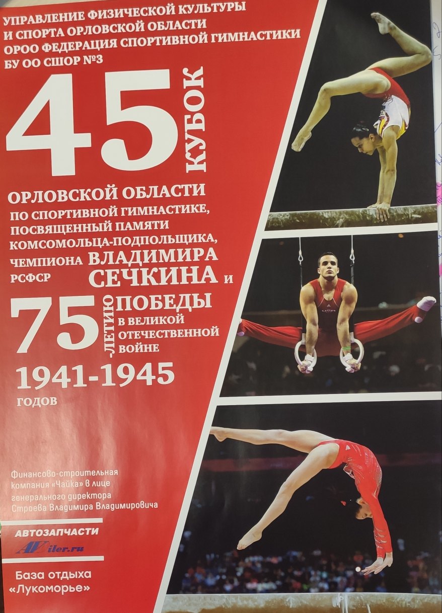 45-ый Кубок Орловской области, по спортивной гимнастике, посвященный памяти чемпиона 40-х годов по спортивной гимнастике, комсомольца-подпольщика Владимира Сечкина и 75-летию Победы советского народа в Великой Отечественной войне 1941-1945 годов.